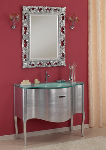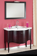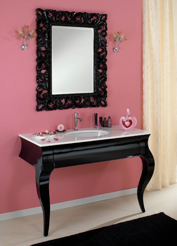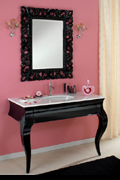 Zu den Messehighlights der italienischen Badmesse Cersaie 2008 gehörte definitv die neue schwarze Lack-Waschtisch-Konsole der Serie Princess mit ihrem schwarzen geschnitzten Lack-Spiegel. Durch sein verspieltes und auffälliges Design wirkt er nicht nur vor einer farbigen Wand, sondern auch in einem schlicht weiß gehaltenen Bad als schönder Kontrast.