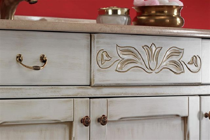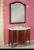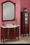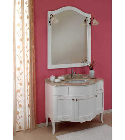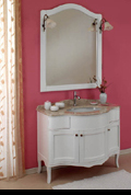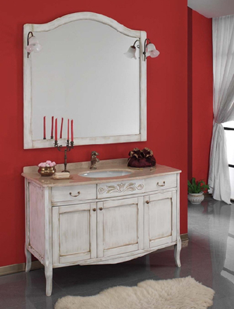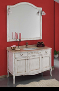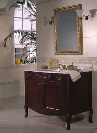 Romantika bietet klassiches Design angelehnt an die Romantik. Es ist in zwei Farbvarianten mit passenden Hochschränken erhältlich, wahlweise mit großen Keramikbecken, oder mit aufgestzter Marmorplatte und Keramik Unterbecken.